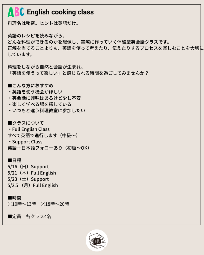 ・Please book at least 5 days before the lesson.
